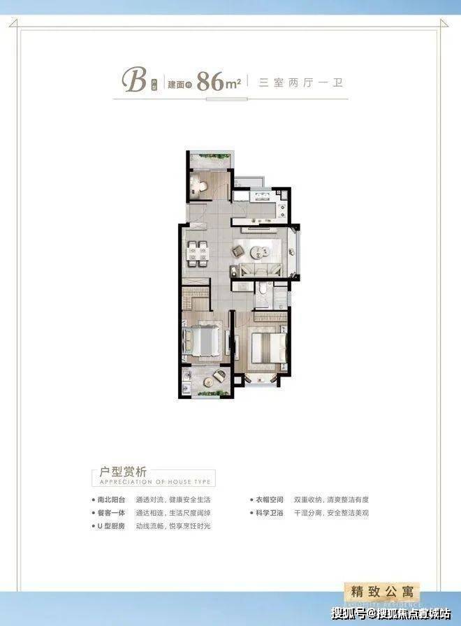 新云都会售楼处营销中心:400-8828-814新云都会售楼处电话/地址☎:400-882-8814(开发商热线)建面约86㎡3房2厅1卫户型特点:做到了双开间朝南+双阳台设计+卫生间干湿分离,一个非常紧凑的小3房户型。