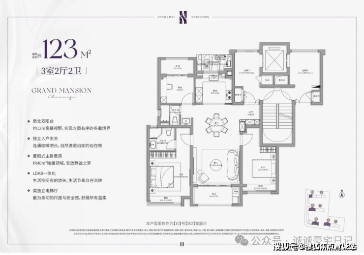 项目建面约120㎡户型是类独立电梯厅的设计,室内则是标准的南北通透+三开间朝南设计;主卧套房配置,自带卫生间,私密性和舒适度俱佳。