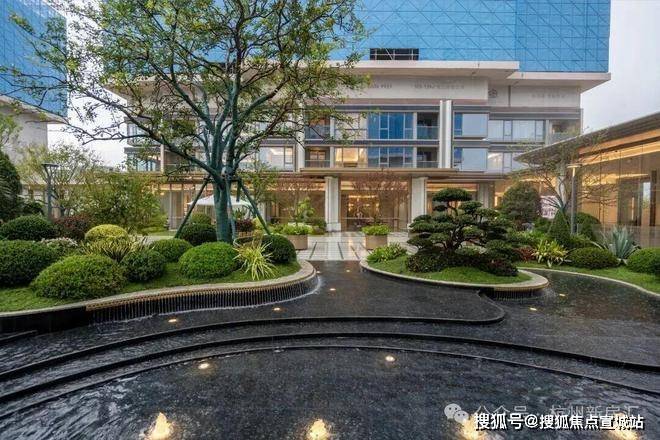 门前两棵罗汉松;园区内的中央园林围绕新型蓝宝石戏水池打造,营造澜韵迎宾、松鸣涧语、鸣泉叠韵、鸣芳拾趣、鸣香径幽等九境空间。