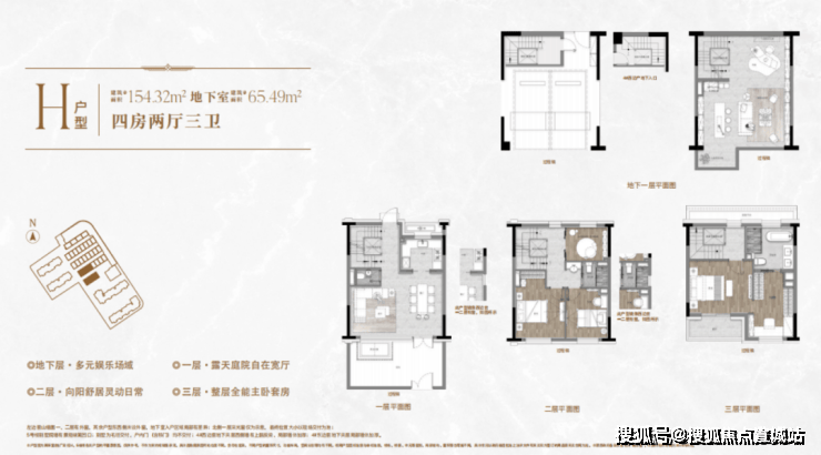 风貌别墅:建面约131-154㎡,地上三层+地下一层,附赠地下室、花园、露台。