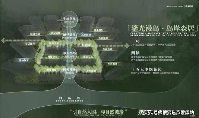 以“山水聚场”理念,规划“一环两轴十五园”景观布局,将水岸、岛屿、森林、花园、树屋作为园林节点,形成“行在景中、坐在岛中、游在林中、意在境中”的美学表达,营造出沉浸式山水活力场域。
