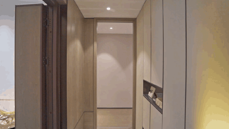 市面罕见的双开大门,推开门两旁是两大排衣柜,能容纳男女主人一年四季的衣物,尽头还贴心地为女主人设置了化妆台。