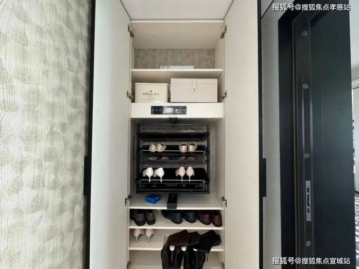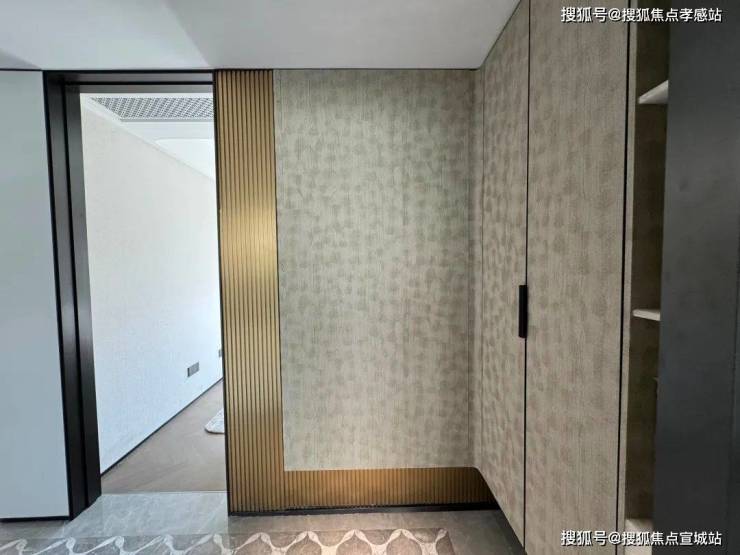入户门是是非常有质感的铸铝门,带电子猫眼智能门锁;进门后是一个独立玄关,木纹玄关背景墙,右侧是通顶的悬浮玄关柜,内置鞋柜精灵和抽拉鞋架。