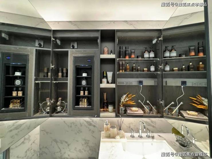 双卫配置,其中一个做了干湿分离,科勒台盆+双智能马桶+高仪花洒,除雾镜柜均内置了牙刷消毒器、预留吹风机插座。主卫镜柜还有美妆冰箱,收纳空间相当充足。