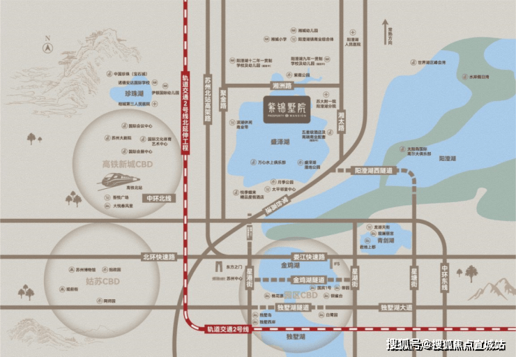 项目位于相城区阳澄湖镇湘州路199号,地处北双湖板块核心,距苏州高铁北站仅10分钟车程,30分钟可达园区主城1。相城区正推进"大疏大密"规划,高铁新城将打造为立体通达的城市空间