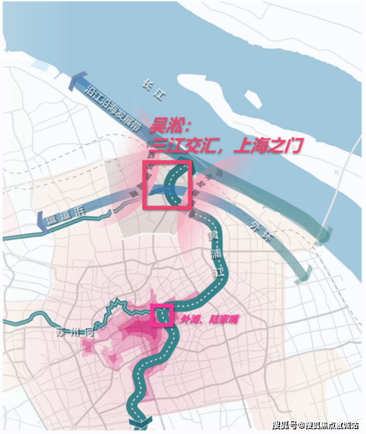 大吴淞地区整体的规划框架是要打造一个标志的“三江交汇”的上海之门,也就是三长江、黄浦江和蕰藻浜。这三江都是具有通航能力的河道,除了能够提供独特的景观价值之外,还能为产业提供很好的航运条件。