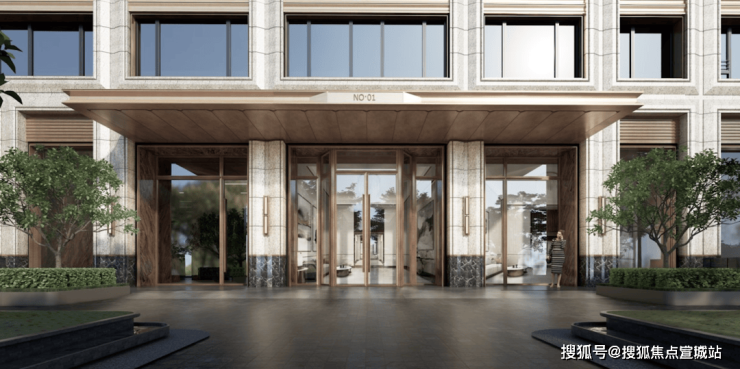 选用石材、铝板等高品质材料,古铜色金属与通透玻璃搭配,结合专属定制单元门及中式挑檐,只为业主归家的一抹温暖质感。