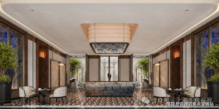 「玉兰门庭」摩登飘逸,环抱式落客前场,大师定制非遗掐丝珐琅门钹,流转温润光华,敬呈归家尊崇礼序,自此启幕生活的华贵序章。