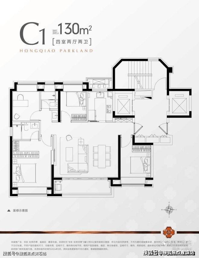 三居室 142㎡:645 万起,三面采光 + 7.4 米横厅,双河视野。