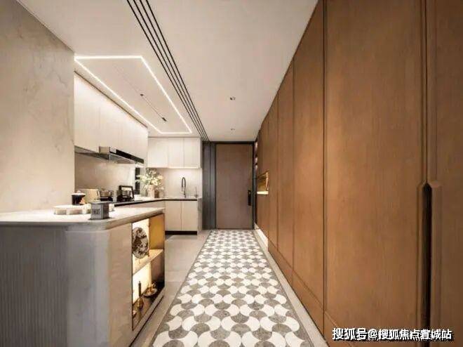 厨房方面,水波纹玻璃+金属造型玻璃移门,隐形上轨,厨房交付线性凉霸、末端饮水、博世或AEG(或同等品牌)烟灶、洗碗机三件套。