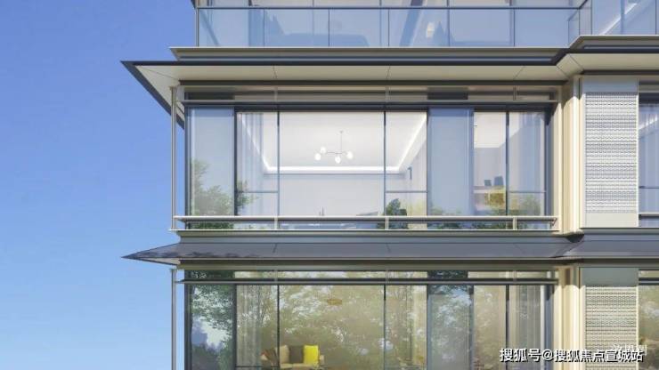 汲取宋式坡顶与挑檐,遵循现代高端镜面立面趋势,臻选高级铝板、石材勾勒建筑轮廓,搭配三玻两腔降噪隔⾳玻璃,以超高窗墙比让室内与自然无界沟通,丰盈宋韵美学。