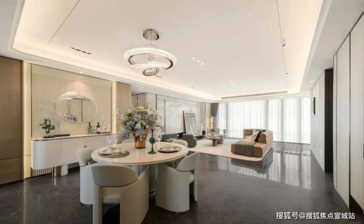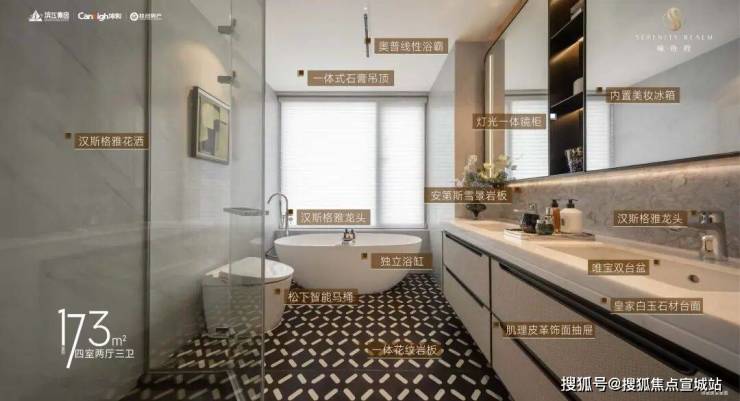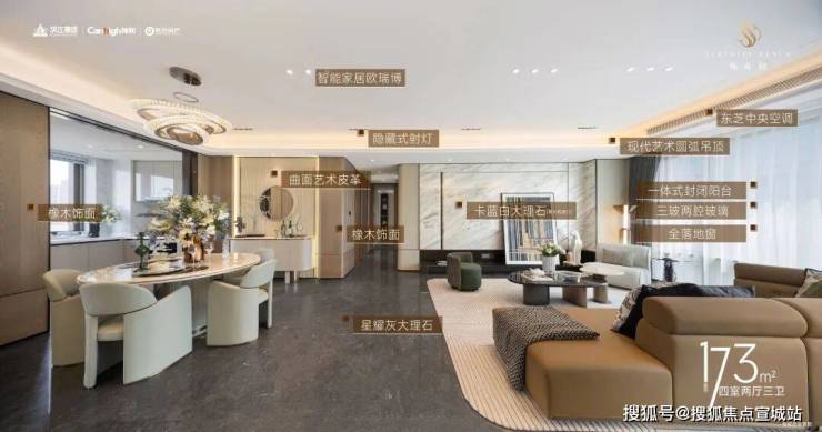 与此同时,咏舟府精装标准也非常高,全线引进国际一线品牌,品质直接对标市场6万级项目。选用东芝中央空调、博世六件套厨电(含双门冰箱)、唯宝台盆、汉斯格雅五金等高端配置。餐客厅墙面选用天然尼斯木饰面。全屋共运用5种不同石材,如奥特曼米黄、塞浦路斯灰、意大利进口鱼肚金等。(具体交付标准以开发商公示为准)。