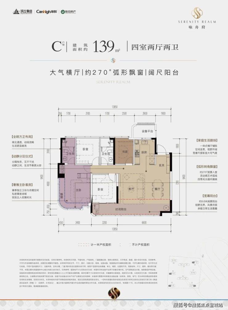 建筑面积约139㎡的C户型,采用南向方厅设计,实现了“大面宽、短进深”的薄锋式布局,实际得房率堪比传统160㎡户型,显著提升了空间实用性与舒适度。主卧更配备270度弧形采光面,尽揽西站核心区的壮丽景观,未来采光与视野均无与伦比。