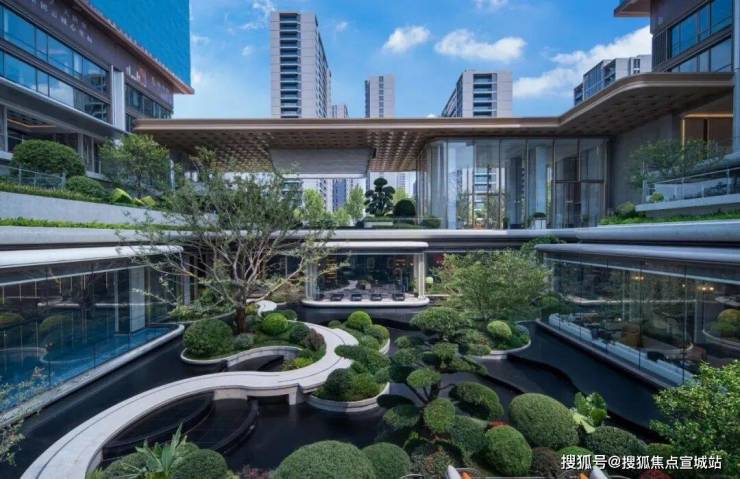 穿过大门,映入眼帘的是中轴下沉式庭院,咏舟府以“漂浮”为设计灵感,精心构筑了立体化、多层次的花园景观。瀑布、水景、植被与观景平台巧妙融合,打造出层次丰富的立体景观空间。未来感与艺术性在此交汇,营造出悬浮于自然之上的生活场景,成为新中心的标志性名片。
