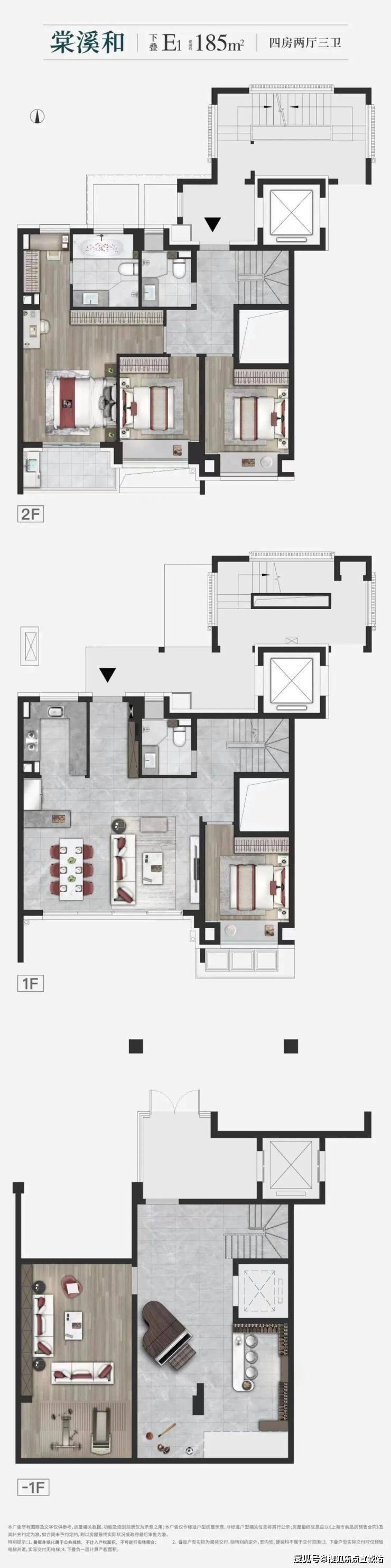 户型图建面约185㎡下叠,保留四房户型的格局,为的就是更大限度的保持业主的宽奢舒适,把下叠业主的未来生活场景想的很明白: