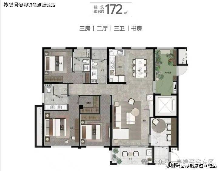 172㎡四房二厅三卫:南北通透客餐厅,动静分离,动线合理。