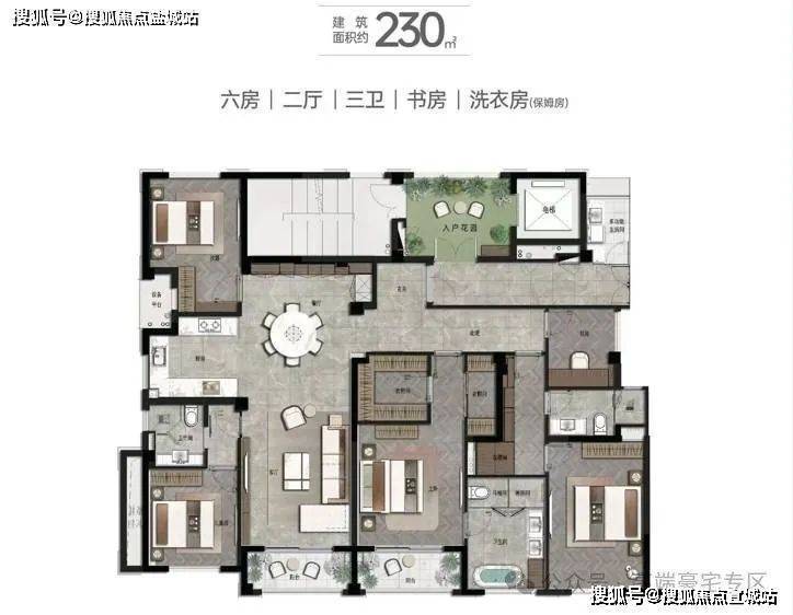 230㎡六房二厅三卫:罕见三套房设计,全明三卫,稀缺 4 + 2 户型,满足一生之宅需求。