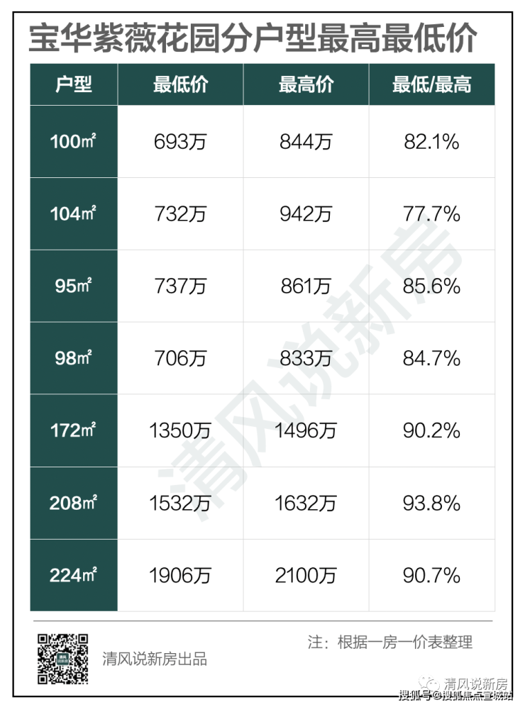 只有主力户型104㎡拉开了一定的价格差距,其余的户型价差并不大,不过本身宝华楼层较矮,特别是大户型基本上层层有景,也的确不需要做太大的价格差