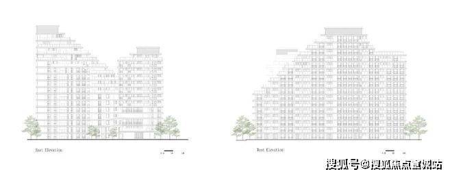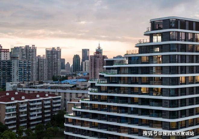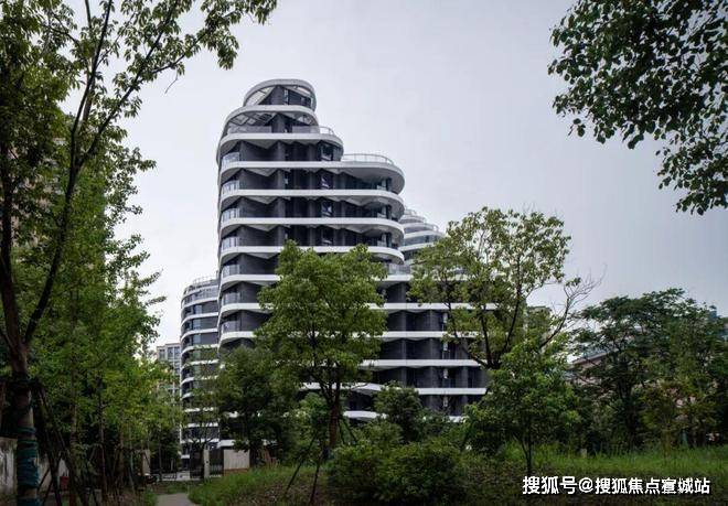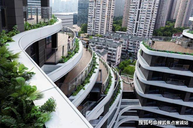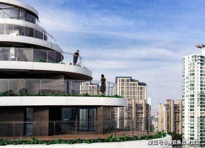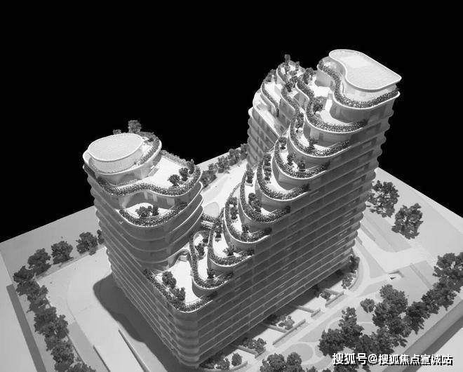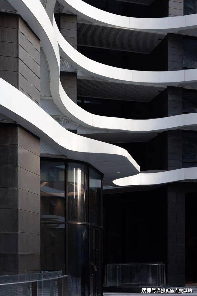 建筑向上层层叠高、向内退进的波浪线型,形成了多维立体的生态居住空间。垂直叠置的弧线形露天观景平台作为私享空间,并根据不同朝向的户型将露台角度开设到最宽,呈现“全画幅”式的景观视野,将城市景观价值最大化的同时,也串联立面转折、观景阳台、屋顶绿化和空中花园,消隐弱化了传统住宅前后错动的复杂轮廓,强化建筑的整体性。柔美的立面山水景观也点染了城市界面,退后的部分更像是传统山水画中的“留白”处理,引人无限遐思。
