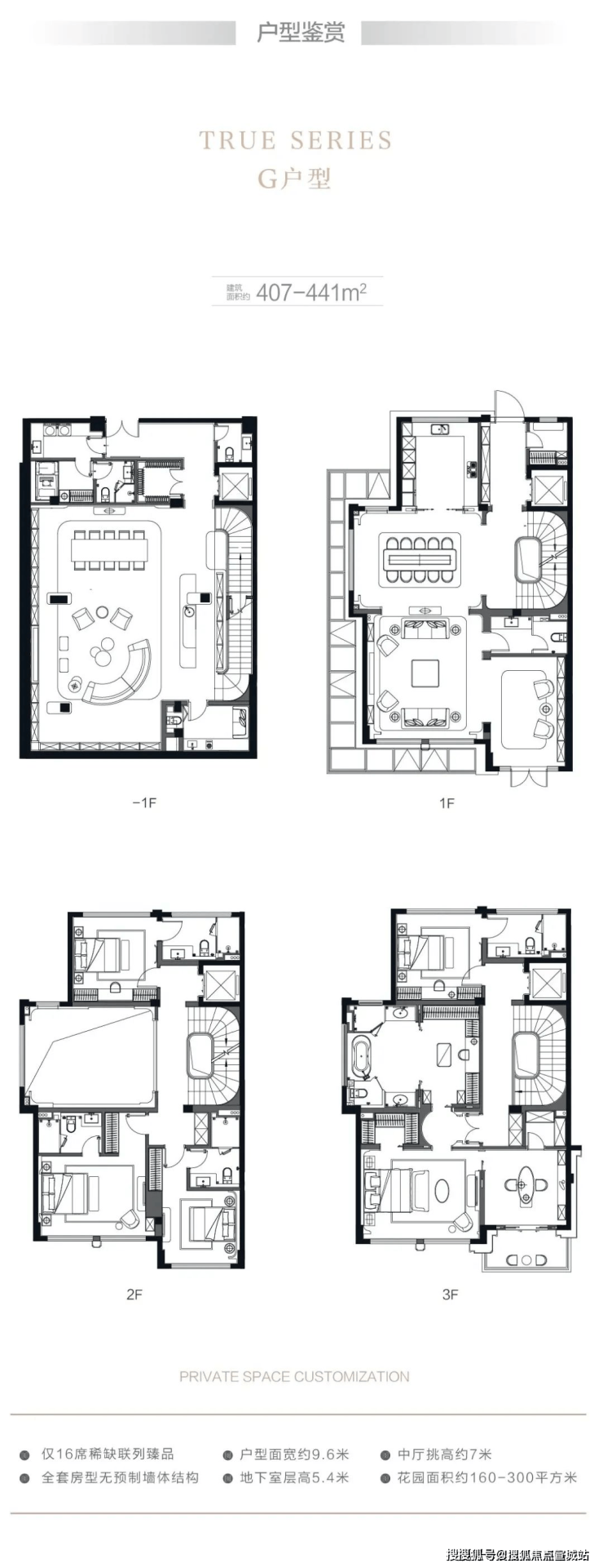 在售户型:建面约310-410平米,地上三层地下一层