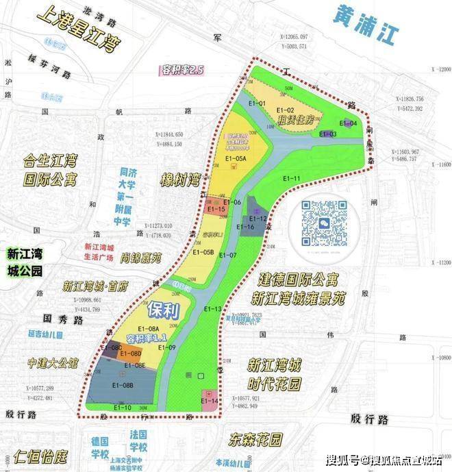 四至范围:东至E1-09规划公共绿地,南至E1-08E公共通道,西至江湾城路,北至E1-09规划公共绿地