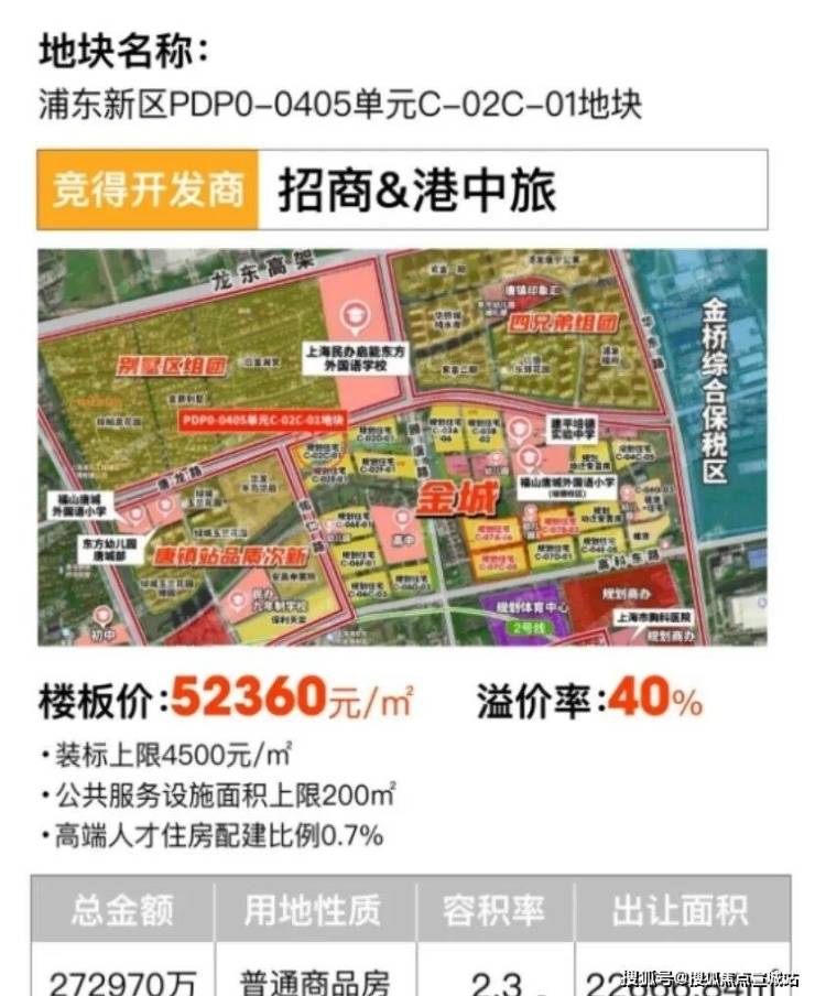 土拍重磅新闻——7月25日上海六批次土拍结束,唐镇地块再次赚足市场眼球!经过62轮鏖战,最终由招商&港中旅以总价27.3亿,楼面价5.24万元/m²夺得!溢价率突破40%!!!未来售价预计将突破9万/m²,已迎来价值爆发窗口期!