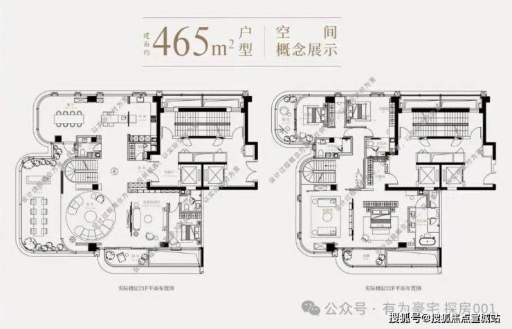 西边套标准层面积330㎡,东边套标准层面积285,西边套顶楼复式585㎡,东边套复式465㎡