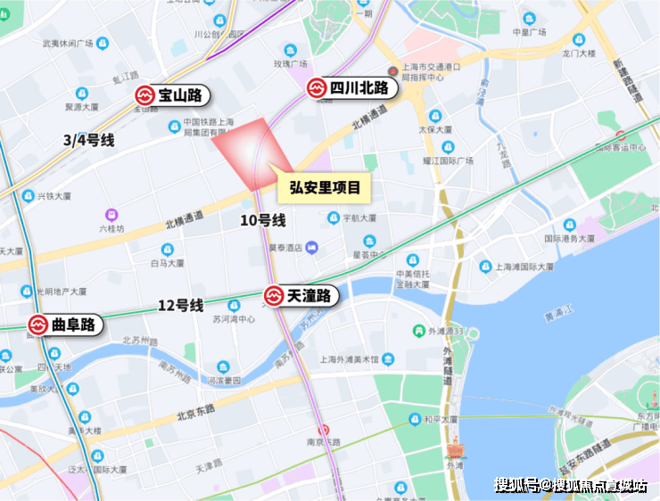 项目距离北外滩核心区,只隔了一条海宁路,距离外白渡桥、外滩源、苏州河都在直线约900米范围内。项目靠近轨交10号线四川北路站,周边还有3号线、4号线、12号线。