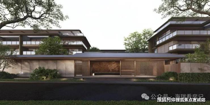 社区立面为新中式风格,以铝板+石材为主,窗墙比3:7,两段式、对称式造型。立面上提取“线面体”中的线和框造型元素,以线条为主、框为辅,通过形体划分,精致线条勾勒,色彩元素及有温度材料等搭配。