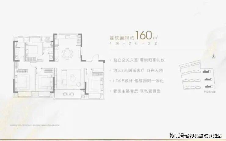 建面约160㎡户型:4室2厅2卫设计,南北通透,主卧套房带独立卫浴和步入式衣帽间,客厅连接景观阳台,厨房采用U型布局,动线合理