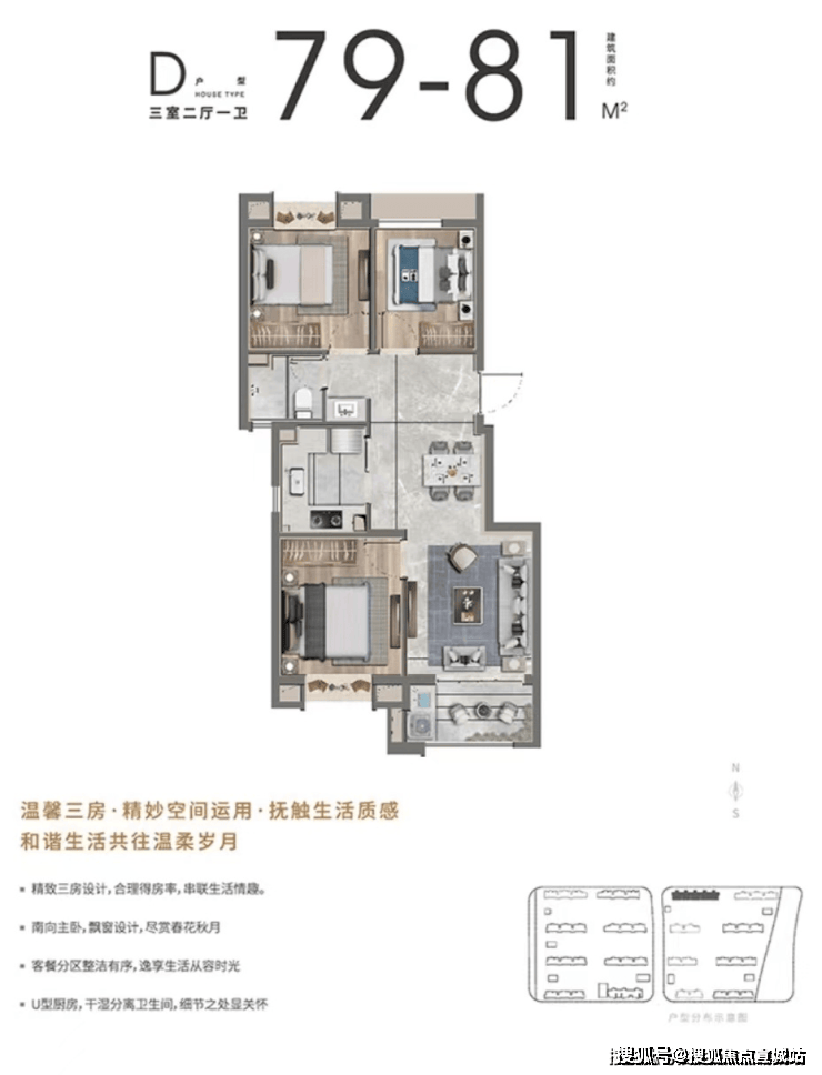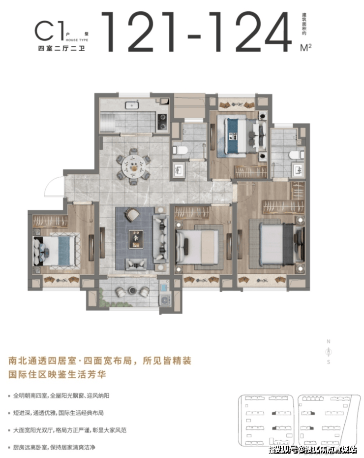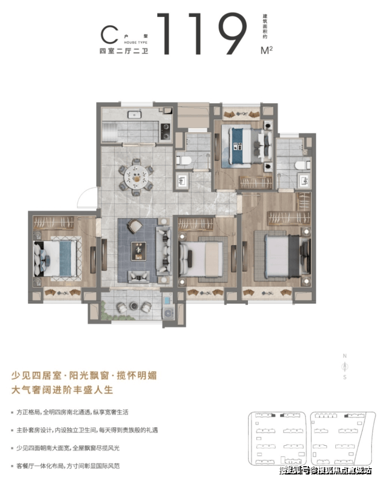 户型:有建面约 96/102/108/119㎡的 3/4 房,二期推出建面约 100㎡三房和建面约 120㎡四房。