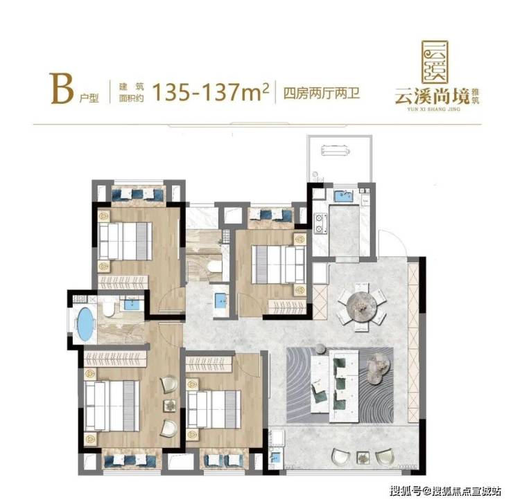 主力户型:有建面约 114㎡的三居,137-146㎡、179-208㎡的四居。