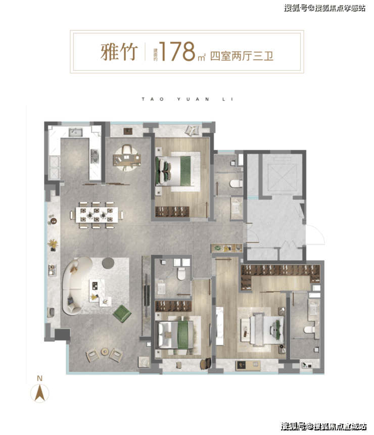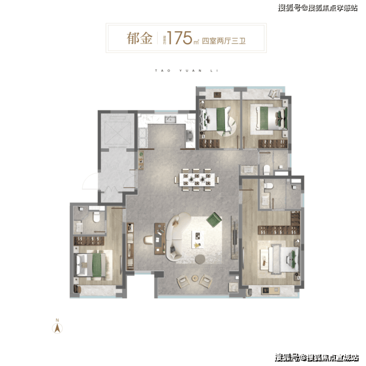 建筑面积约165㎡户型样板间,打造南向4.5开间,即在4开间的基础上,通过设计手法将餐厅、客厅、厨房、阳台融为一体,让传统竖厅的通透格局同时具备横厅的宽广空间。