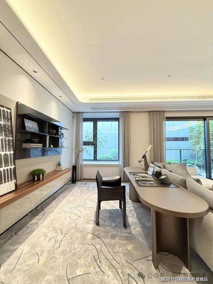 室内设计,秉承摩登东方的理念,设计以人、生活为中心,从空间本体和情感层面都回归生活,270度环幕采光,开放式会客厅设计,兼具尺度感与功能性。