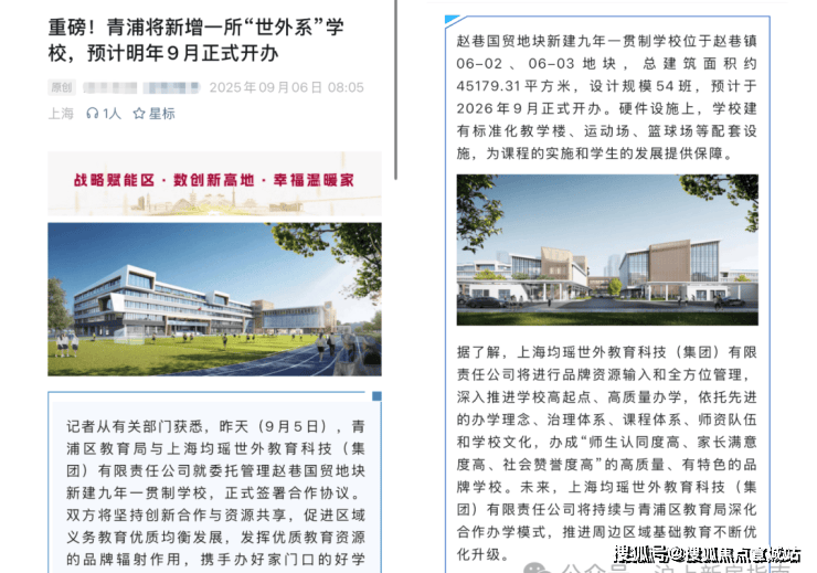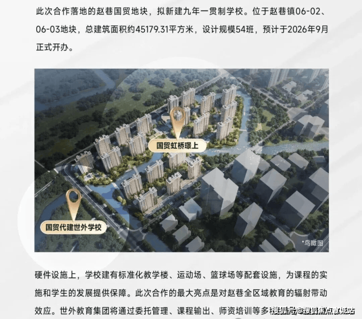 9月5日“世外”正式官宣落定赵巷,这所世外托管的公办九年制学校为国贸代建学校,与项目仅一路之隔,未来大概率对口。 (期房不承诺学区,学区划分以教育局公布为准)。
