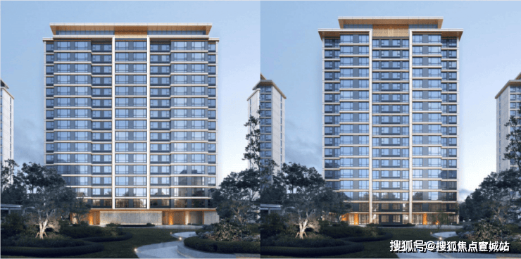 现代风格: 立面利用大面积玻璃+阳台落地窗+金属型材+层间装饰提升建筑整体感和精致度,外立面大面采用浅色仿石多彩漆,浅灰色金属格栅,浅灰色玻璃,香槟色金属型材收边形成创造出建筑独有的人与自然、动静结合、丰富美观的轻盈质感,彰显住宅品质