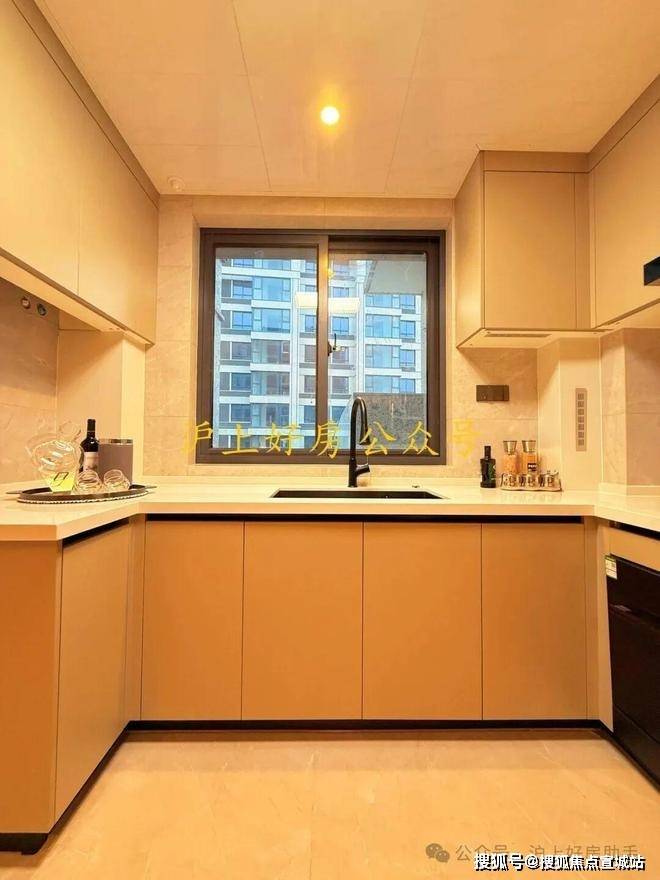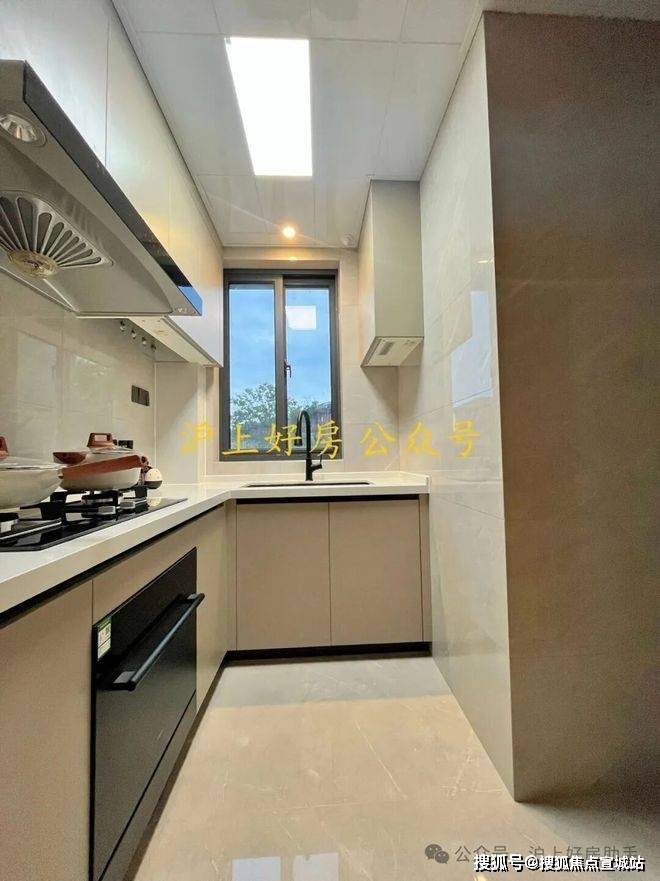 U型厨房,在这个面积段颇为难得,操作台面富裕;全玻璃移门设计,通透明亮。