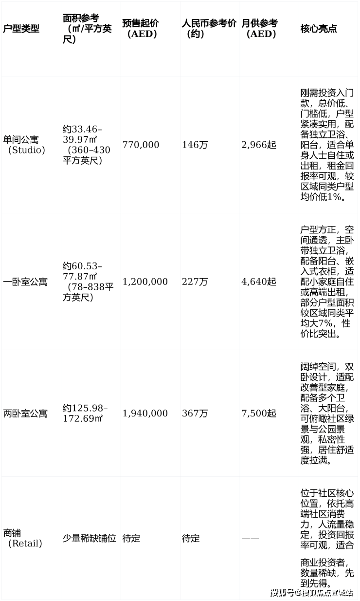 项目户型覆盖全面,主打单间、一居室、二居室三大刚需投资型户型,面积跨度合理,价格门槛低,77万迪拉姆起即可入手永久产权房源,同时价格较JVT板块同类户型更具竞争力,部分户型较区域均价低1%-3%,性价比拉满,适配单身人士、小家庭及全球投资者。