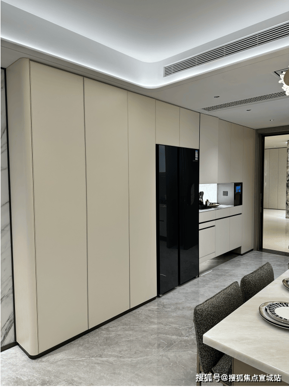 进到实地约99平样板房,整个玄关柜几乎全部都是皮质缝线包裹,细节拉满;
