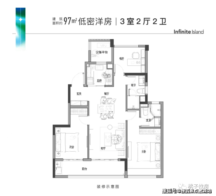 建面约97㎡起步户型,三房两厅两卫格局,南向三开间,次卧与客厅的阳台相连,打造大尺度的双联阳台,还有很大的亮点就是玄关设计,可以很好地护好后期业主的隐私。