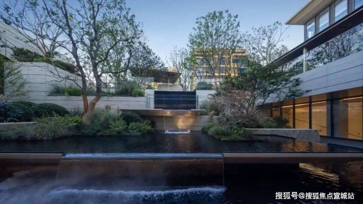 悬崖水景及下沉庭院水景共计七层叠水,施工最大高差达9m。通过抬板立体规划,构建多维垂直园林景观。悬挑式整石观景平台提供360°环屿视野,8级落瀑以流水连接高低空间,形成灵动动线,演绎“流水别墅”的美学内核。