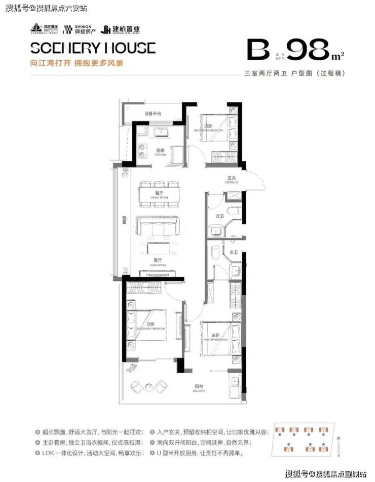 户型面积:建面89~98平方米,主要为三居室