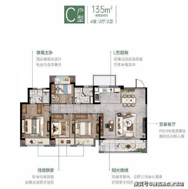 户型设计:建面约99-135㎡全双卫户型,配置中央空调、新风系统,严选一线家装品牌,如方太油烟机、大自然地板、科勒智能马桶盖、美的中央空调等。