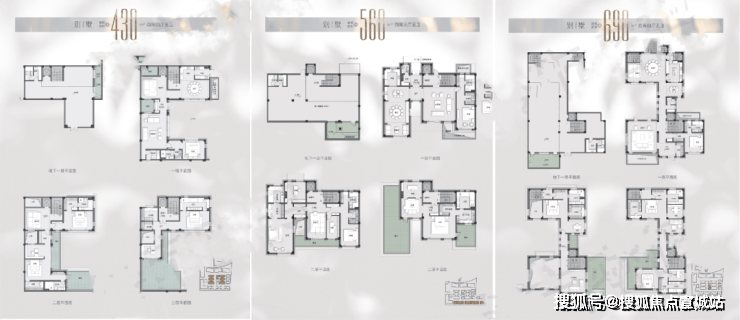 1号楼为保障房,2、3、4、8#为洋房,5、6、7、9、10#为别墅。洋房建面约170-340㎡,别墅建面约430-690㎡户型图如下:170㎡这户型房源不多,总价段应该不低于2500万。340平米这个户型设置了保姆房和家政空间,还分别设置了两个入户门,仪式感拉满。三间卧室,全部为套房设计,书房都有独立卫生间和储物空间。而这个户型房源会略多一些,预计总价应该在5000万+。别墅是大头,且都是拼接型别墅:地上三层,地下一层,从430㎡-560㎡-690㎡三种,都是四房四厅五卫的设计。预判8000万应该是其主力总价段本地块属于上海市低密度住宅的核心区,区域内住宅地块出让及供应皆极为稀缺,且周边交通便捷,居住氛围成熟,生活配套完善,为西郊地块的核心优质资源;