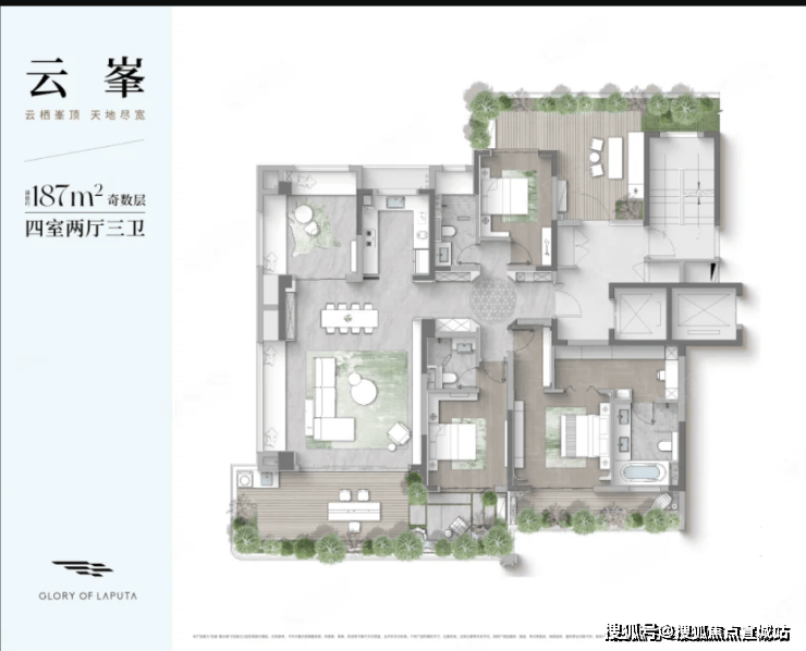 户型点评:4房2卫的房屋套型;偶数层南向超大L型空中庭院;四开间、三卧室朝南设计;偶数层北面有个北庭院;