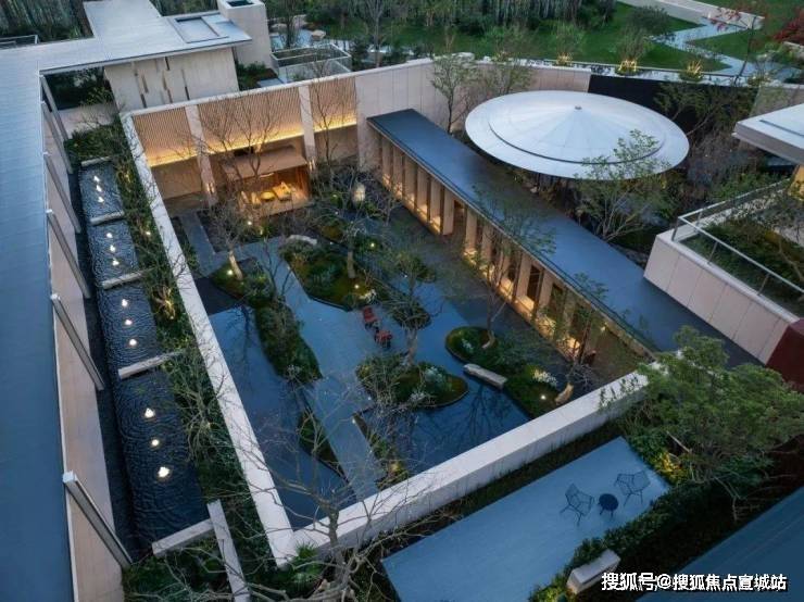 步入社区,首入眼帘的是6米高水幕的下沉式山水庭院,与周围建筑融为一体,将自然与松弛感带给社区。