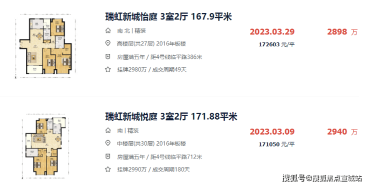 再看二手房,瑞虹新城板块次新房挂牌均价在10-18万/㎡不等,整体上越新的房子越贵,比如瑞虹6789期目前挂牌普遍在15-18万/㎡。