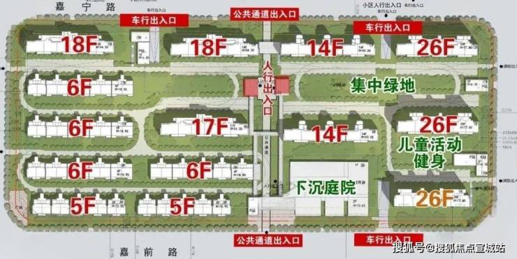 根据公示图显示,该项目的4个小板块最高层为项目东南角和西北角的26层高层,共有6栋,高度接近地块限高的80米(77.80米);18层的共有8栋;17层共有6栋;14层共有4栋;13层共有2栋;6层的共有4栋;5层的共有8栋。