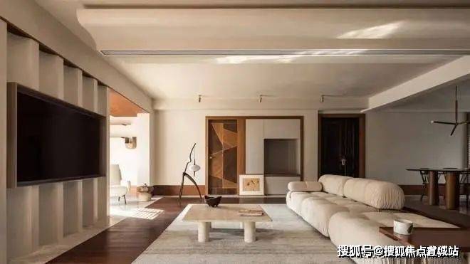 电视背景墙双色木纹板拼接做装饰。