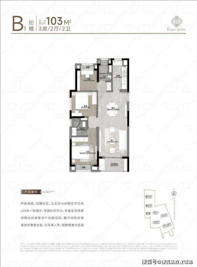 户型特色:采用大面宽、短进深设计,生活区全朝南,动静分离,全套房配置,部分户型享 270 度景观视野。